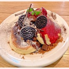 今日のランチは横浜でパンケーキ😊 期間限定のバレンタインチョコレートとフランボワーズソースのパンケーキ 3段 2,178円♬ 生チョコレートやジャンドゥーヤアイスクリームなど5種類のチョコレートスイーツを組み合わせて、甘酸っぱいフランボワーズソースをかけたチョコ好きにはたまらない一品です😋