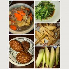 今夜のまかない❣️ 肉じゃが❣️ 小松菜炒め❣️ ポテト🍟❣️ ごま餅❣️ メロン🍈❣️ 軍曹殿も接待でお客様を連れて来ていたが奥様の紹介は良しとして👍 お酒のお酌は嫌だ!そんな安ぽい嫁じゃないです😒 息子に言ったら母さんにそんなことさせると息子に怒られて拗ねている😠
