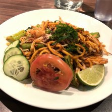 ミーゴレン (ノ≧ڡ≦) マレーシア風味スパイシー焼きそば 揚げ豆腐、海老、蒲鉾に青梗菜やモヤシなどの野菜も沢山.♬*.+゜ ガーリックと唐辛子のきいたパンチのある焼きそば