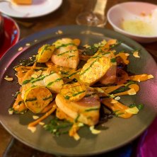 お誕生日月なので、よく通った居酒屋の大将にお祝いしていただきました♡ ランチコースでしたが、大きなお皿にちょびっとなオシャンティーなお料理… お魚ゎ赤魚、お肉ゎ鶏むね肉。 パンにつけるオリーブオイルも何かで受賞したこだわりのモノらしいけど、物足りずにオーダーしたアヒージョが1番美味しかった。 次回ゎ餃子にラーメンでいーよ( ˊᵕˋ ;)笑笑