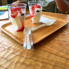 昨日のおやつ 塾帰りのお兄ちゃんと一緒にカフェであまおうソフトをいただきました。