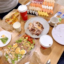今日はみんなで旦那家族のところへ行き、その後旦那の両親と旦那兄夫婦が家に来るはずだったんだけど急遽旦那の両親は行かない〜ってなって旦那兄夫婦だけ来た🤭 子供達の寝かしつけしてる間に旦那と旦那兄夫婦がコストコでご飯買いに行ってくれて子供達寝たから大人4人で食事会🤗 楽しかった💓 お寿司🍣が食べたいって私が言ったからお寿司買ってきてくれた❤️幸😍 あとはコブサラダ、ロティサリーチキン、ホットドッグ…💓 プルコギベイクもあったけど食べきれなかったから明日いただきまーす⤴️