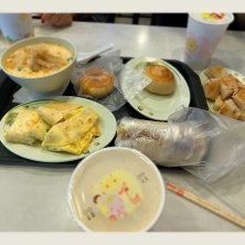 鹹豆漿という台湾朝ごはんで有名な、おぼろ豆腐にザーサイや干しエビ等の塩味が付いたスープです。 中に揚げパンがちぎって入っていて、結構ボリュームがあります。 素朴な味だけど大好きです。 24時間営業の朝ごはん屋さんでいつでも買えます。 鹹豆漿 25元(約84円) 起士蛋餅 35元(約117円右上、チーズ卵入りクレープ的な?) 蘿蔔糕 45元(約151円左上、大根餅) 冰豆漿 18元(約60円写ってないけど豆乳)