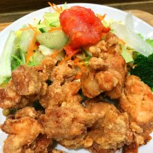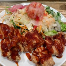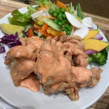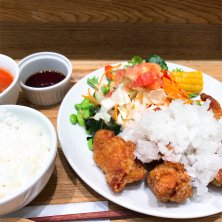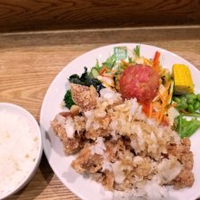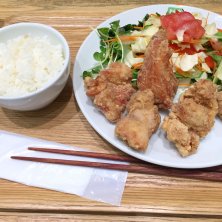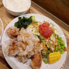 東京都と神奈川県に数店舗有る唐揚げの店、らんまん食堂のおいしいサラダと唐揚げ定食。 唐揚げ、サラダ、選べる白米か玄米と味噌汁がセットになった定食。唐揚げは塩、醤油、黒酢、明太マヨ、ハニーマスタード、ガーリック山椒か週替わりチキン南蛮の7種類から2種類の味が選べる。やはりシンプルな味付けで食べたかった事も有り、塩と醤油に。御飯は玄米にしたかったが、売り切れの為仕方無く白米に。ちなみに自分は白米よりも玄米の方が好きである。