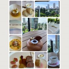 子羊のグリエ ビーツのバリエーション にんにく香るジェソース 馬に見立てたバターミルク ピンクグレープフルーツのマルムラード エストラコンのソルベ 柑橘のマルムラードとソース ソルベアールグレイ 小菓子 紅茶 デザートは、外のテラス席で〜 さらに眺めもいいし、たくさん写真も撮りました♪♪♪ お誕生日は、いくつになっても、嬉しいものです💖