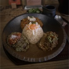 ヤム邸「全がけカレー」 ・れんこんの柑橘ココナツ和えと食べる ほうれん草のカキ出汁キーマ ・りんごとさつまいのオイル添え ゴボウの旨味のアップルポークキーマ ・赤カブのタイハーブピクルスのせ 金柑とスパイス発酵大根の牛とんキーマ カレースープ付き 久々に来れたー‼️ やっぱりコチラのキーマは美味い😋 ╰(*´︶`*)╯♡ 色んな食材とスパイスが絶妙にマッチ❣️ 最後はスープをかけて、スープカレー風に食べるのをオススメされました。 かける前にペロリと食べちゃいそうです…。