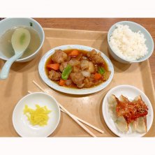 2026年2月24日 ランチ 外食 合計 1,000kcal 酢豚定食(餃子3個+キムチ+食べる辣油) カロリー計算はAIと相談しておおよそで 写真よりも実際のお皿とかが小さい。ご飯も小盛りにしてもらった。