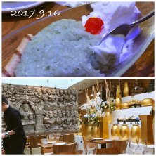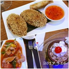 夕ご飯の続き★仲間がオーダーしたスィーツには驚いた。洋風おはぎ的なもの。タイでは定番らしい。緑色のもっちりとしたごはんをおむすび風にまとめてあり、それに生クリームが添えてあった。お腹一杯でなければ案外美味しく食べたかもしれない、笑。