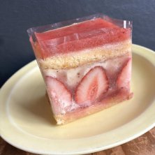 おやつフレジエ〜 たっぷりシロップを打ったしっとりふわ食感の生地、なめらかなムースリーヌ、しっかり酸味のある濃厚な大粒いちご、いちごのジュレ、トップはいちごのジュレ いや、これめっちゃ美味しいわ! 焼菓子屋パルタジェ