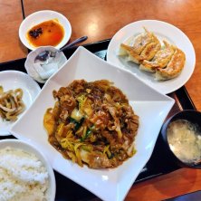 八宝菜定食+元祖餃子 ボードに書かれたランチメニューの文字だけ見て決めて、勝手に塩味の餡だと想像してたら、まさかの中国醤油の濃い色の八宝菜😵 でも結果オーライな旨さ👍 これに、中国茶と見まがうばかりの薄ぅいコーヒーが付きます😁