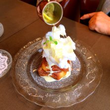おやつにフレンチトースト食べました! 上にわたがしが乗っていて、レモンのソースをかけて溶かして食べるスタイルでした。 オシャレでとても美味しかったです♡♡ さっぱりして夏にぴったりです!