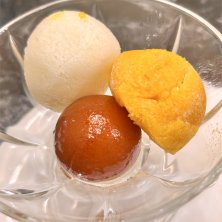 ビリヤニハウスの投稿は何度かしているので、今日は初めて食べたインドのデザートをご紹介。黄色いのはマンゴーシャーベット。すっきりした甘さで冷たくてスパイスで熱った口の中がさっぱりしました。茶色いのはグラブジャムン。世界で一番甘いと言われるお菓子。親の仇ほど砂糖を練り込んだドーナツをガムシロップに浸した…と言えばなんとなくお解りいただけるだろうか?歯茎が痙攣するくらい甘かった。白っぽいのはグラブジャムンを揚げずにシロップに浸した感じ。フワフワしているからシロップを絞り出して甘さを下限しました。