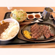 午前中に赤池で用事があったので、ついでにステーキ食べに来ました🥩 ご飯、サラダ、カレー盛り放題なので、サラダを限界まで盛りました🥗 お肉150gでも十分な量🍖 これで税込1000円いかないんだから素晴らしい😆