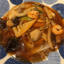 『麻布茶房』 五目あんかけ焼きそば、1,500円 エビ、ホタテ、イカ、白菜、にんじん、キクラゲ、筍、青菜など 腹八分目くらいの量 百貨店内のせいか周りの客は全員ご婦人でした😅