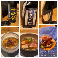 大阪出張初日 1軒目① 日本酒ペアリングと創作フレンチの会員制ビストロへ。 1杯目は十四代極上諸白 紅ずわい蟹とウニのムース 初っ端から贅沢😅 2杯目は磯自慢largo しまあじ 藁焼き?と思うような香ばしいしまあじと、ものすご〜く細い芽ねぎ、ほのかな柚子の香りが美味しかった😍 3杯目は黒竜220周年記念酒 オマール海老と鶉、肥後赤茄子、発酵トマトのソース、茗荷のガリ乗せ 火入り絶妙でふるふるの鶉、ぷりぷりのオマール海老、梅干が隠し味のトマトソースに、味しみ赤茄子が美味🩷
