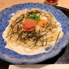 たらこと湯葉とモッツァレラチーズのカルボナーラ 今朝も病院でした。 いつもはランチ迷うのに、今日は最初からパスタの気分でした🍝最近食べてなかったからかな〜 せっかく買い物に寄ったけど、何も買わずに帰りそう😅