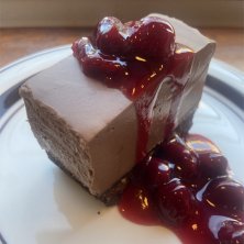 チェリーソースのノーベイクチョコレートチーズケーキ🍒🍫🍰 2年前に大人気だったチーズケーキが期間限定で登場しました✋ チョコとマスカルポーネを合わせたチーズケーキは濃厚ながら後味サッパリ、甘酸っぱいチェリーソースがよく合います✨
