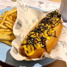 今日のランチはホットドッグとフライドポテト🌭🍟 Ume hotdog @Umedogs フランクフルト、チーズ、オニオン、和牛ソース、マヨネーズ、海苔トッピング ジャパニーズ ストリートフード ♪( ˊωॢˋ )) ❓❓ なお店 😆