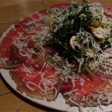 今宵は職場の仲間が誕生日を祝ってくれました(๑˃̵ᴗ˂̵) 心温まるイタリアンディナー‼️ 前菜3種にパスタは仙鳳趾産牡蠣を使ったものと、道産牛を使ったものの2種。 メインは道産豚のロースト‼️ デザートはお祝いメッセージが入ったチーズプレート🧀 ワインもイタリアの白を中心に何本か開けちゃいました(笑)