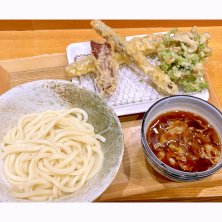 関東に数店舗有る丸亀製麺系列の饂飩の店、ふたば製麺の期間限定メニュー、秋の味覚天肉汁つけうどん。赤茄子天、焼き芋天、牛蒡天、春菊牛蒡寄せ揚げの天ぷらに饂飩とつけ汁がセットになったメニュー。毎月期間限定メニューを食べにここに来ている。但し、9月のは半熟卵が入っていたから食べなかったけど。