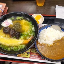 残業になったので資さんへ。大海老天うどんに椎茸トッピングにミニカレー。カレーには沢庵がついてくるのが資さん流