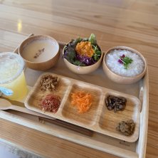 伊東から東京へ帰る途中で大井松田に住んでる友人とランチして来ました。おしゃれな良いお店で、メニューもちょうどおかゆセットがあったのでそれにしました。スープとおかゆ半分食べてあとは友人にあげました😜