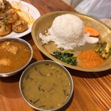 先の投稿につづき、ネパール料理のお店。ネパールカレー。 ダルバートという料理で、ごはん、豆スープ、カレー、アチャール(漬け物)がワンディッシュになったます。日本食でいうご飯、お味噌汁の定食ってな感じです。 ネパールカレーはインドカレーと違い、油が少なく味付けも素朴なのが特徴。 豆スープとご飯は大体どのお店でもお変わり自由です。このお店は塩味があるので、個人的に好きです。