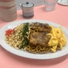 3/12オープンの焼きそば専門店。 スクランブルエッグの黄色、豚焼肉の茶色、青海苔の緑、揚げ玉の白、紅生姜の赤と色鮮やかな焼きそば。ソースは甘めで、ちょっと好みが分かれそうです。 亀戸やきそば 680円
