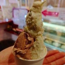 こんにちは❗️ 地元ランのゴール実家手前のジェラートショップにて水分補給(ง •̀_•́)ง 写真ではわかりにくいですが、そそり立つ盛り盛り具合が素晴らしい‼️ 白は地酒【松乃井】酒粕、オレンジは雪下人参、地元の美味いもんフレーバーです。