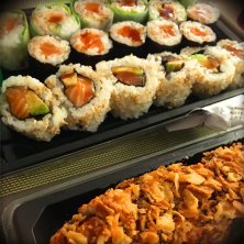 夜食に Waitrose のお寿司。手前のクランチスパイシーえび巻きは唐辛子がまぶされていてかなり辛い。