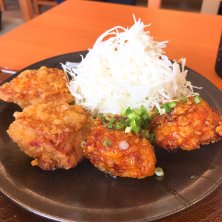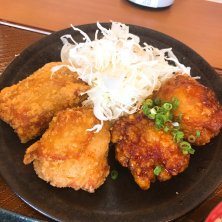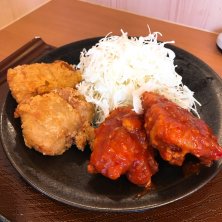 合い盛り定食〜♫ ちょっと甘い秘伝のタレに漬け込んだから揚げとノーマルから揚げの合い盛り! 更にレベルが上がったなぁ〜d(^_^o)