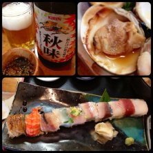 江ノ島 舟善 ビール、ハマグリ、地魚一文字寿司 さあて、どっちから行くか ‥ ^^;