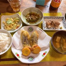 長野市信州新町信級地区食堂かたつむり のぶしな定食750円 茄子🍆鋏揚げ🍆筍蒟蒻蛍烏賊🦑煮物、蕗煮物、蟹玉子焼き、筍汁鯖缶入り