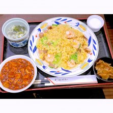 東京都府中市 府中駅前の商業施設、武蔵府中ル・シーニュの1階レストラン街の中に有る中華料理の店、麻辣房の店長のおすすめAセット。 海老チャーシューレタス炒飯、麻婆豆腐、搾菜、スープと杏仁豆腐がセットになった定食。炒飯はまあまあのボリュームが有り、麻婆豆腐はハーフサイズの量やった。これだけのボリュームで色々品が揃っていて950円で食べられるのは安い。どの料理もとても美味かった。 向かいに有るスーパー銭湯、ラクスパステーションで温泉に入った帰り、夕飯を何処にしようか考えた時この店で食べる事に決めた。