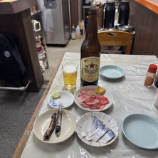 #サウナ の後は #久しぶり の #角打ち #赤松酒店 さんで #サッポロ黒ラベル で #アルコール消毒🍺 #冷奴 #ウインナー #お好み焼き #コンビーフ ごちそうさまでした( ^ω^ )