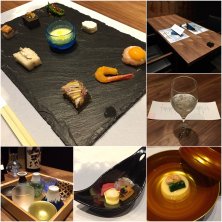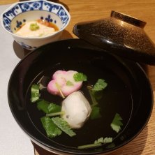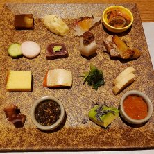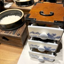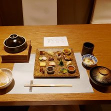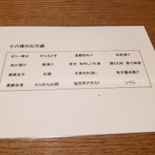 四阿(あずまや)の続き.... 土佐はちきん地鶏 黒七味焼き 茗荷と白葱ピクルスと ずわい蟹クリームコロッケ 黒豆枝豆と 真鯛と浅利のセロハン蒸し 土釜飯 福島県産ミルキークイーン お供三段 引き出しの中は.., 出汁巻玉子・北海道産明太子・香物 はらこおろし・紅鮭・和牛時雨味噌 鯛昆布〆・旨出汁でお茶漬け 練乳葛餅 甘夏ソースの甘味で終わり。 お供三段の引き出しは面白かったです(*^^*) どれも美味しい料理でした♪