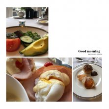 今朝の朝食✨ 昨日から気になっていたものをどうしても食べたくて… どっちも食べてしまいました😅 一つ目はエッグベネディクト。 そしてシュークリームwithチョコレートソース。 ついでにアプリコットのデニッシュも💓 苦しいけど朝から大満足です💕