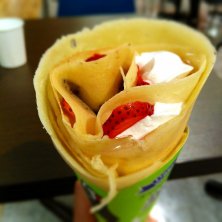 買い物ついでにクレープ♥🍓 皮だけが意外と美味しいらしい!と言うので作ってもらえるか聞いてみたら、シュガーバターのシュガーバターなしで、料金は変わらず…と言うので、もう普通にイチゴチョコ頼んじゃったよ。 そしてキャプション打ってる間に娘がめっちゃ食べ進めていて、もうイチゴが無いという。 さあ雨降る前に帰らねば!