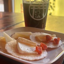 ここはスタイリッシュな角打のお店。スレンダーでボーイッシュな美人の女将さんに相手をしてもらいながら、酒は栃木県さくら市の「仙禽」のセットを。醸した酒のタンクの、底の方(あらばしり)、真ん中(中汲み)、上の方(責め)、それぞれの異なる味を楽しむ。全体に現代的な風味、フルーティでドライな感じ。栃木の酒のあては、カラスミ。女将さんとの楽しい会話も含めて、大変良い組み合わせだった。こちら店主さんはどんな蔵元がつくっておられるのかも見極めて仕入れておられる。
