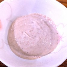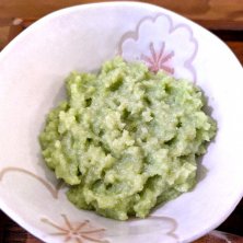 ずんだ餅 ちょっと硬めのお餅にたっぷりとざくざくのずんだ餡がかかっています。ざくざく感が堪らないずんだ餡とお餅の相性が抜群です。