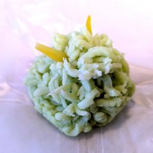 青鬼 癖のない白小豆の粒餡を芯にして、この店独特のフルーティな練りじょうよのそぼろをまぶし、黄色の羊羹で鬼の角を現したこの季節特有のきんとん菓子です。そぼろの色は翠で、青鬼を表してますが、対になる、そぼろの色が桃色の赤鬼もあります。