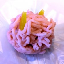 赤鬼 癖のない白小豆の粒餡を芯にして、この店独特のフルーティな練りじょうよのそぼろをまぶし、黄色の羊羹で鬼の角を現したこの季節特有のきんとん菓子です。そぼろの色は桃色で、赤鬼を表してますが、対になる、そぼろの色が翠色の青鬼もあります。
