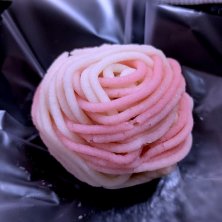 千代の糸 白小豆の粒餡を芯にして、紅白の練りじょうよの生地を小田巻状に巻き付けた非常に美しいお菓子です。そして、この練りじょうよの生地がこのお店独特の果実を思わせる味わいでとっても美味しいんです。