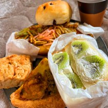 ★キッシュ ★キウイフルーツサンド ★焼きそばサンド ★チョコレート入りパン ★ヴィーガンアップル 気になっていた、人気のパン屋さんへ 開店前(朝の6時から)から行列の人気店。 今日は、9時から、有料駐車場を探すのに手間取って既に20人ほど😅 争奪戦のサンドイッチにキッシュもサクサクで美味しかったです😋種類が少なかったので、次回は余裕持って行きたいなぁ。 オツピッピ