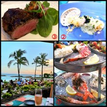 ハワイのレストラン 滞在中三回行ったんです、ここ 食べてみたいメニューが多かったのと、何と言ってもオープンエアで心地よい海風を感じるこの立地が最高だったんです ①クイーンズプレート コナロブスターテール、赤キングクラブ、カウアイ島のシュリンプ、オイスター、ツナのタルタル、カジキのディップ等 迫力のハワイ風海鮮盛り、こう言うのも一回は注文したいですね ②鮑のスパゲッティ、キャビア、柚子バター ③ブラックアンガス ニューヨークリブアイ ミディアムレア 肉の断面が見事でした