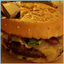 【27日夕食】 今日は疲れたので、ホテル近くで高級ハンバーガーを買って部屋で食べました。 "GBK Cheese & Bacon" £9.95 Crispy bacon, BBQ sauce, house mayo, dill pickle, salad Choose from: Mature Cheddar, smoked Applewood, or American cheese 想像以上に美味しい❗ "The price is expensive but is delicious."