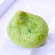 鮎 白いプックリとした個性的な姿の鮎ですが、味わいもとても変わった鮎です。まず、外側は玉子生地ではなくてういろうです。そこでプリっとした食感と米の香りが素敵です。内側は求肥ではなくてあんこです。しかもこし餡を翠に染めた餡で包み込んだものなんです。味わいは一般的な鮎と全く別物ですがとっても美味しいんです。