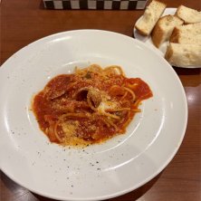 今日ランチ。 この時代に、1,100円はすごい‼️ 🥗と、フォカッチャおかわり自由もついて、 満腹、満足でした🍝😋💕