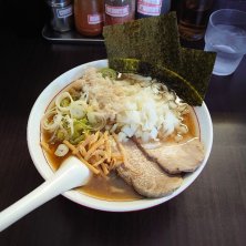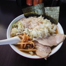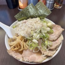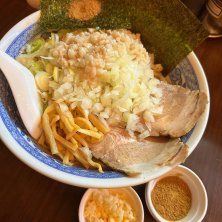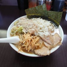 2度目‼️来れまし〜 「ラーメン300g」食券にニンニクあったので〜ポチッと❕(夕方から歯医者だけど😅🤭) 無料の「身入り」(国産背脂) ここ好き😋