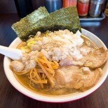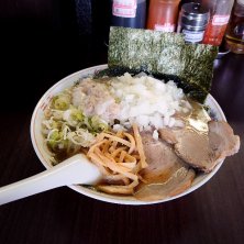 ラーメン身入り 玉ねぎトッピング 850円。 煮干しのスープに太麺、流石ケンちゃんラーメンインスパイアです😋